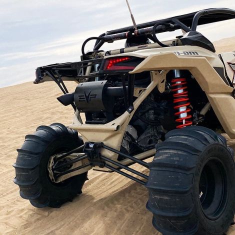 Evolution Powersports is proud to add the 2017-2021 X3 MAGNUS exhaust systems to our already formidable exhaust arsenal. Big Turbo Maverick X3’s making 250-500 horsepower is the new trend. To achieve this kind of power, exhaust back pressure must be minimized. Back pressure in the exhaust system after the turbocharger directly limits maximum engine power. The full 3″ CNC mandrel bent piping and large muffler internal pathway maximize the exhaust gas flow and therefore power. The X3 MAGNUS Exhaust Systems are handcrafted in our Arizona manufacturing facility from TIG welded 304 stainless. The race bypass turbo pipe utilizes our proprietary “chain mail” flex below which has been developed specifically for the rigorous off-road environment and the extreme heat produced by a big-power turbo engine.